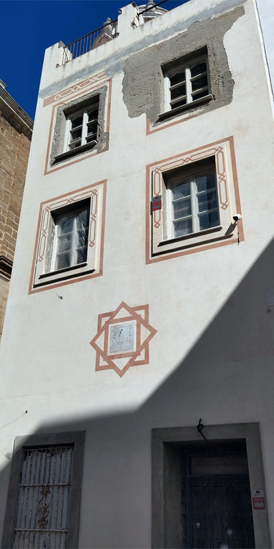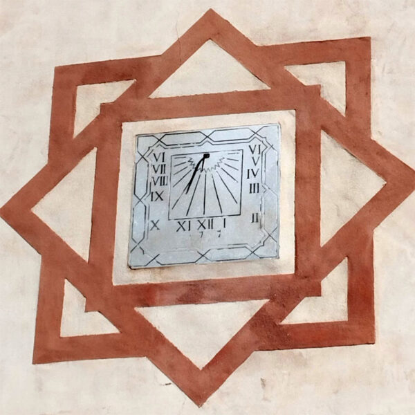 En una plaza situada junto a la Torre de Levante o del Reloj, de la Catedral gaditana encontramos este reloj solar grabado en piedra cuyo limbo está rodeado de una cinta con dibujos arabescos entrecruzados.