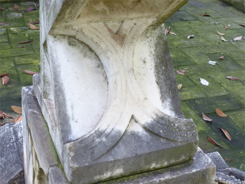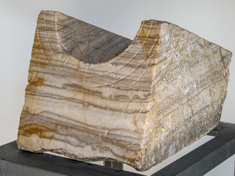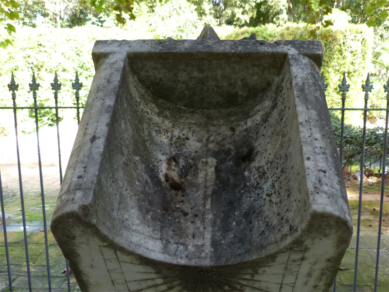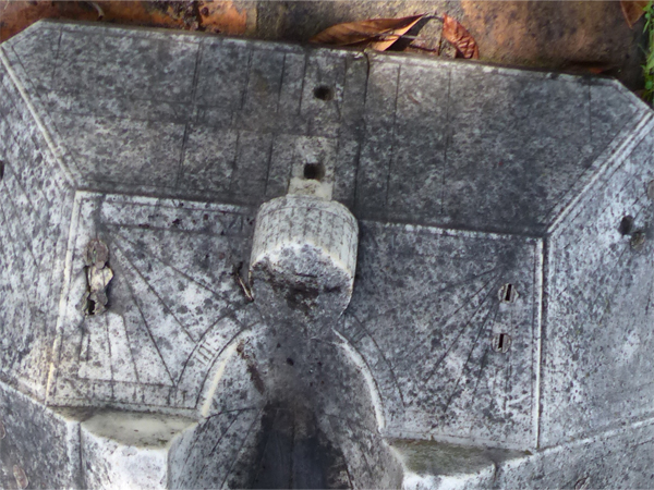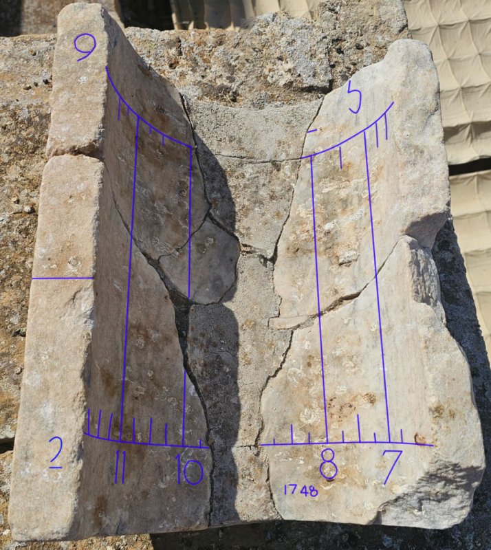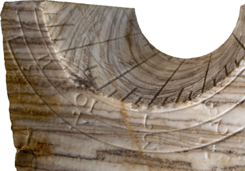 Los dividimos en sólo seis espacios, en lugar de los doce que corresponderían si el gnomon estuviera situado en el centro del semicírculo, ya que este reloj polar está ausente de gnomon, y la hora en dicha superficie es leída por la sombra de las propias aristas superiores del hueco formado por el semicilindro.
