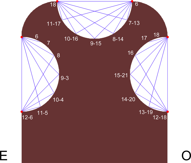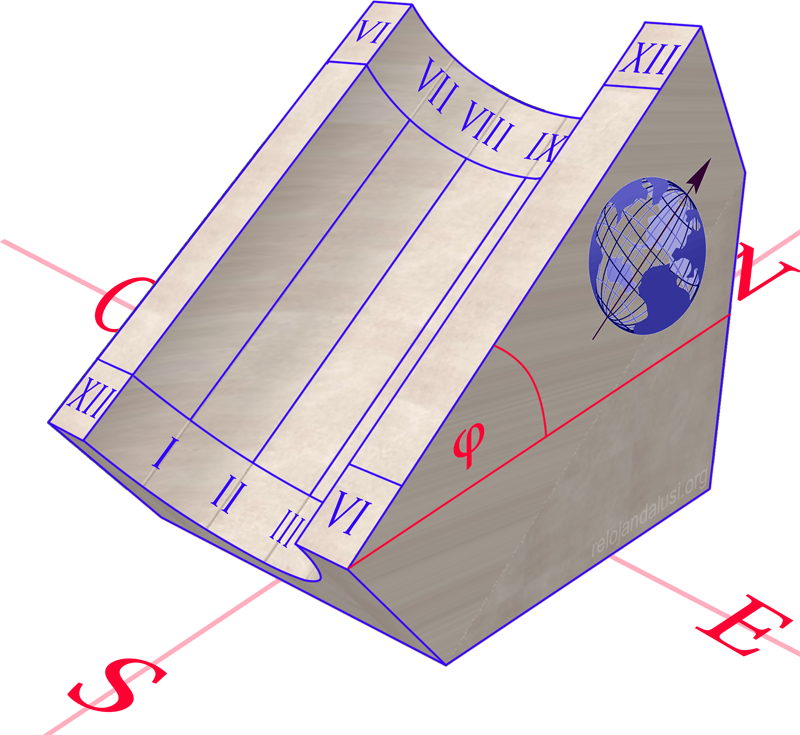 En este caso las líneas horarias se distribuirán en doce espacios distantes entre sí 15º. Así, por la mañana, son señaladas las horas en su sector occidental, avanzando la zona iluminada por el sol desde el cénit del prisma semicircular hasta su base. En cambio durante la tarde, es la sombra la que va avanzando conforme pasan las horas, desde la parte oriental hasta el cénit.