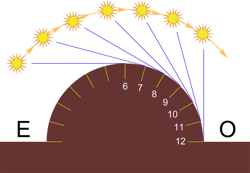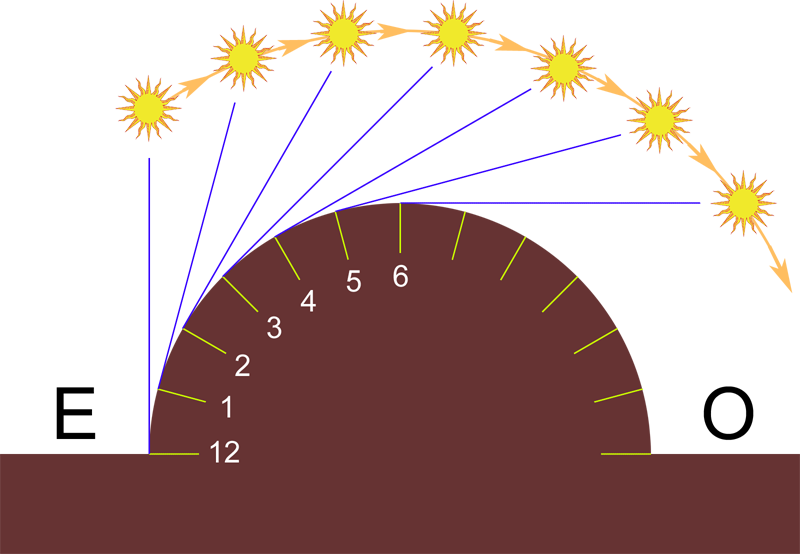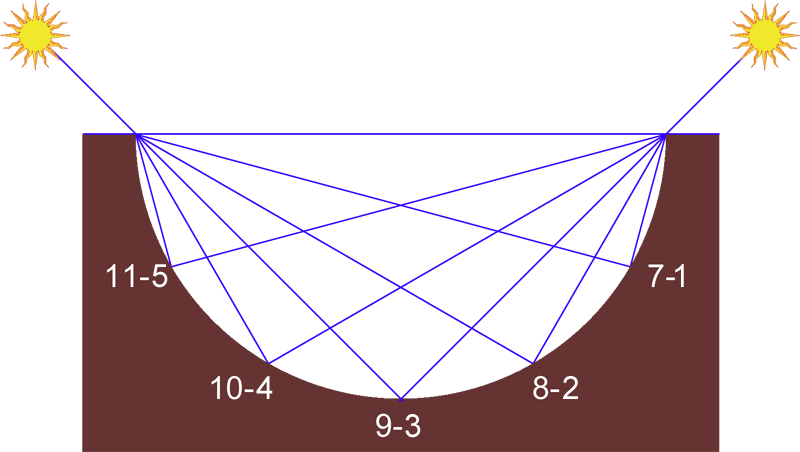 Por tanto a las seis de la mañana, solo permanece iluminada la mitad oriental del prisma semicircular y a las seis de la tarde, la occidental. Y como ocurre en los polares cóncavos, al mediodía no se produce sombra, encontrándose soleada toda la pieza por encontrarse el Sol en su punto de culminación diario.